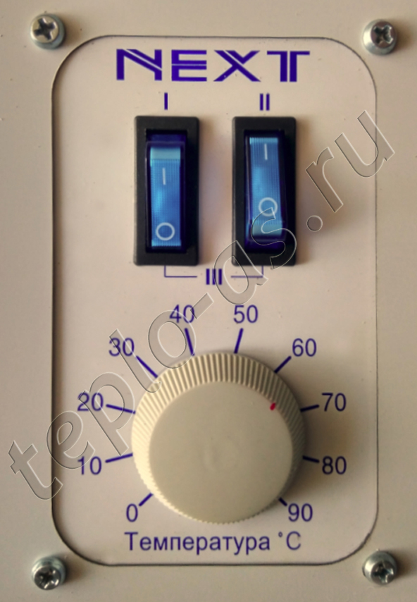 - панели управления (14), с расположенными на ней выключателями ступеней мощности (15) и терморегулятором (16), служащим для установки температуры нагрева теплоносителя.